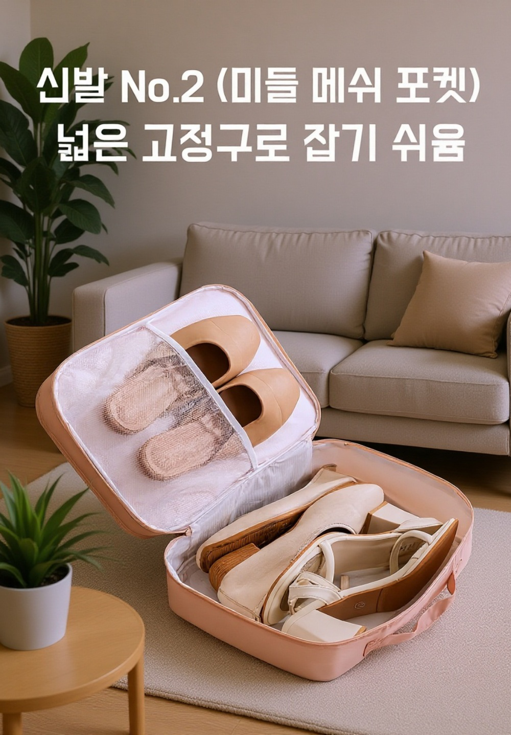 여행 가방 옆에 놓인 신발 수납 가방